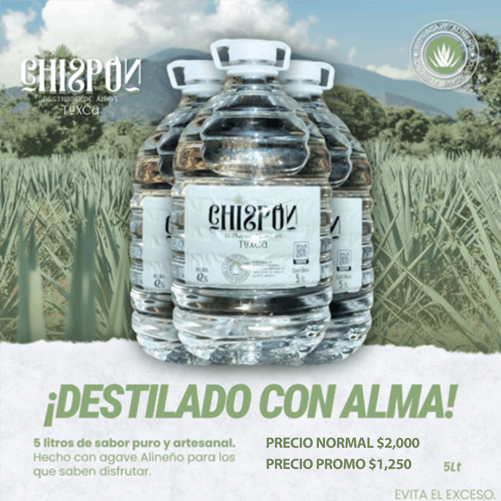 Destilado artesanal de agave Tuxca en presentación de 5 litros. Elaborado con agave Aliñeno 100% de la región, este formato premium es perfecto para eventos especiales, restaurantes o coleccionistas que valoran la autenticidad y calidad.